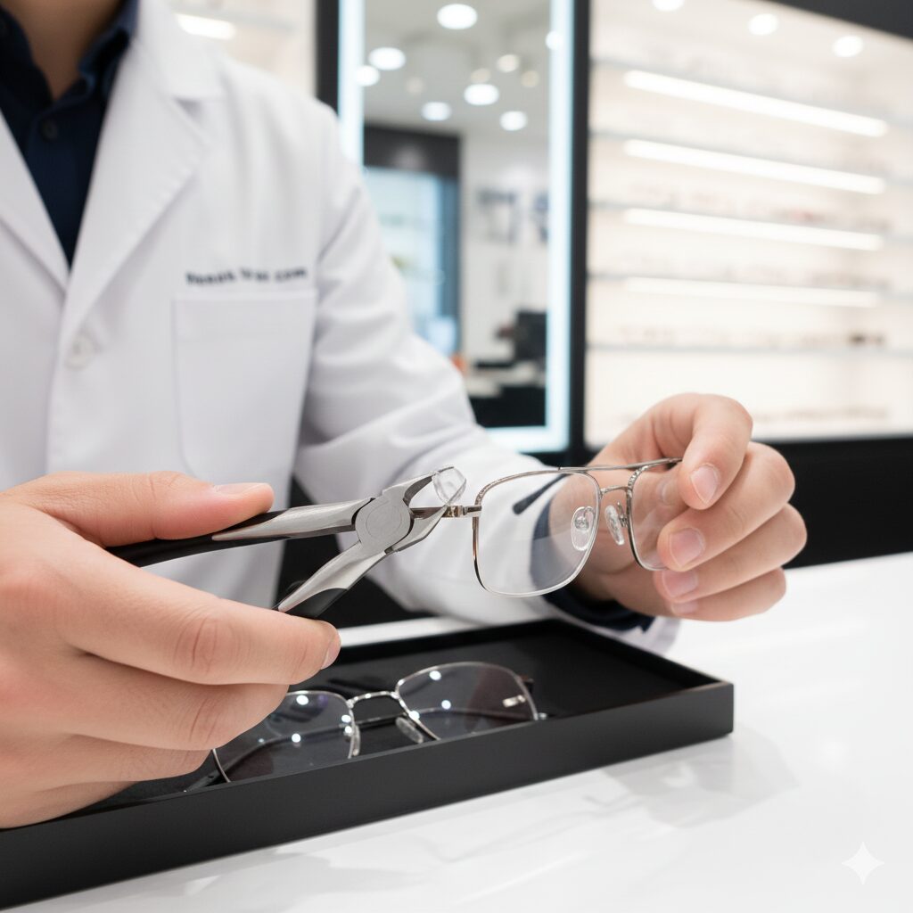 - 前傾角(パンコスコピックチルト)の修正:フレームのフロント部分が顔側に傾きすぎている(お辞儀している)場合、ヒンジ部分を調整して角度を垂直気味に起こします。これだけで、頬に突き刺さっていたリム下部がスッと離れることがあります。