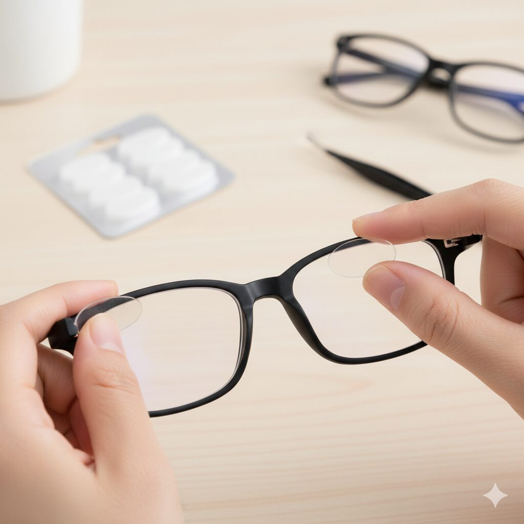 「近くに眼鏡店がない」「忙しくて行く時間がない」、あるいは「プラスチックフレームで鼻パッドが一体型になっていて、金具の調整がそもそもできない」という場合もありますよね。そんなときは、市販の便利グッズが救世主になります。